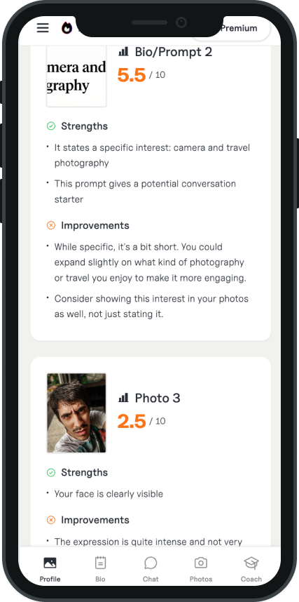 Your profile is your first impression - it's why you're getting (or not getting) matches. Our AI gives you brutally honest, actionable feedback so you know exactly what to fix to start matching with the right people.